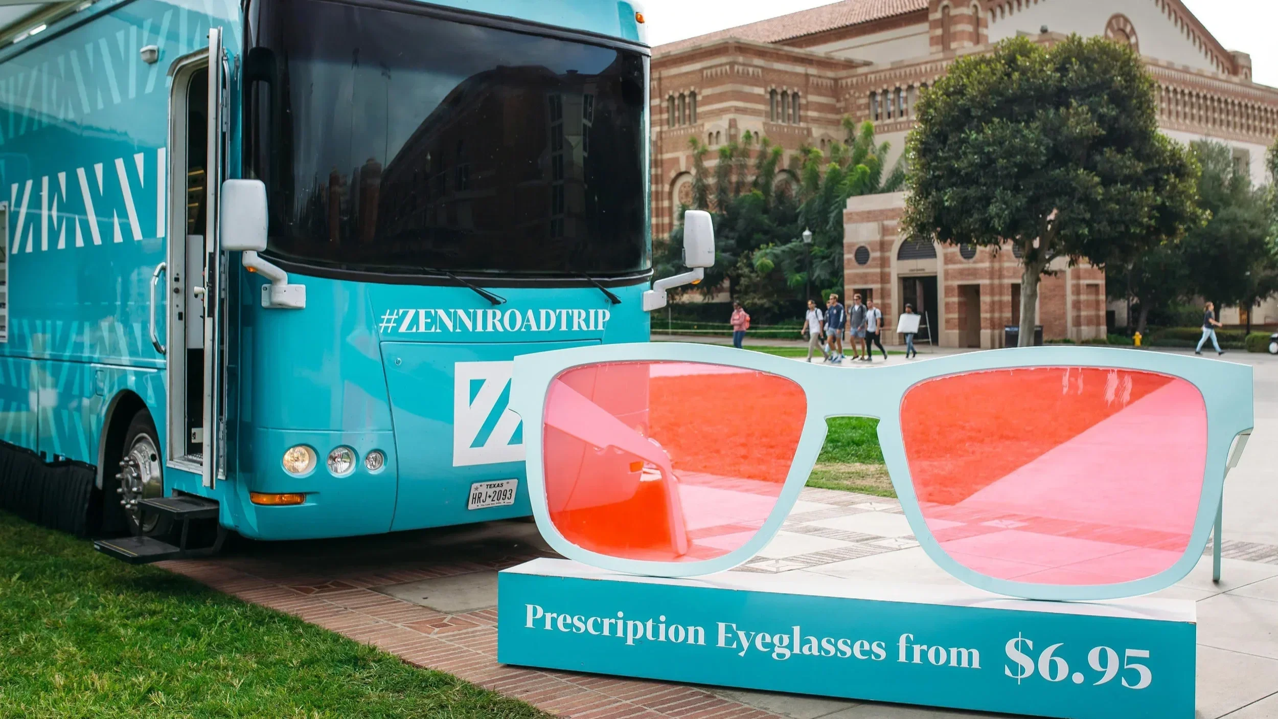 Take Zenni IRL. Build a mobile showroom bus and tour major Western U.S. campuses to create try-on moments, style content, and community.